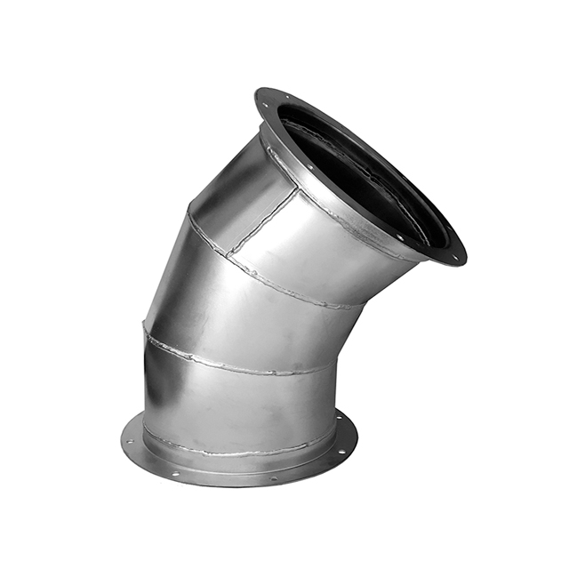 Los codos de calibre 12 permiten cambiar la dirección del flujo de aire en una línea de conductos de recolección de polvo. Los codos de acero galvanizado calibre 12 son estándar con extremos de brida en ángulo (ANGFL). Las bridas angulares se unen sin apretar y se retienen a través de un labio vanstone.