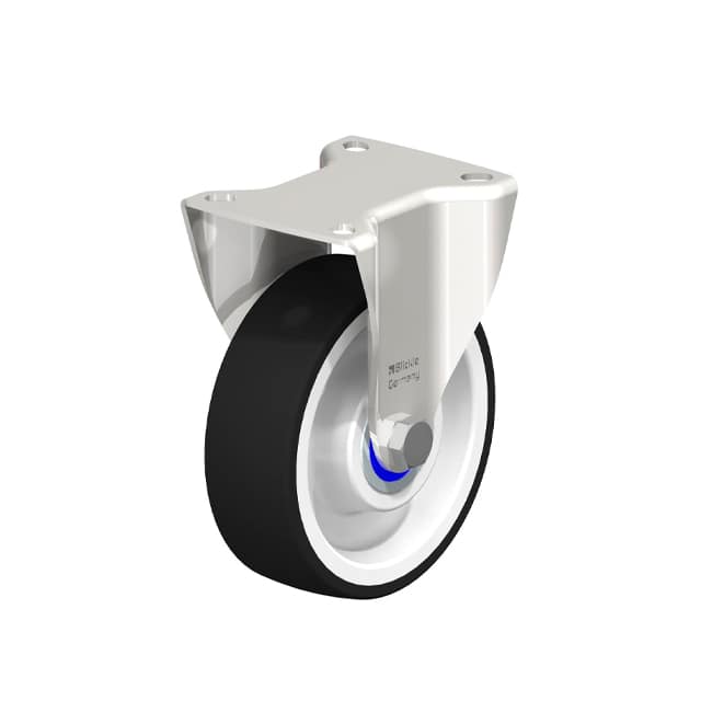 Rueda fija de acero inoxidable para carga pesada, con platina atornillable, rueda, con banda de rodadura de poliuretano termoplástico, con núcleo de poliamida pesado