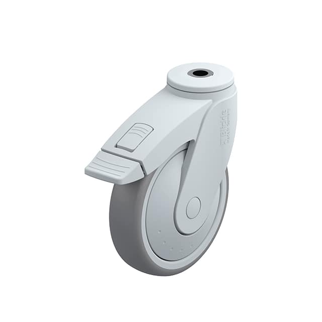 Rueda giratoria de material sintético, color gris plata, con freno 'stop-fix', rueda, con banda de rodadura de goma termoplástica, con núcleo de polipropileno, con placa anti-hilos de plástico.