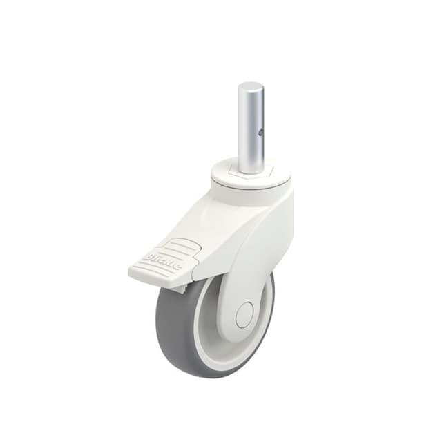 Rueda giratoria de material sintético, color blanco grisáceo, con espiga, con freno 'stop-fix', rueda, con banda de rodadura de goma termoplástica, con núcleo de polipropileno