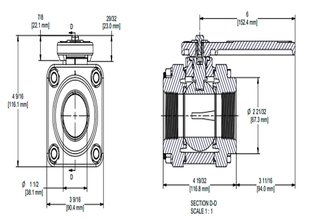 - La bola autoalineable se mueve libremente contra los asientos de PTFE para un funcionamiento suave. La válvula se abre y se cierra con muy poca presión sobre el mango.